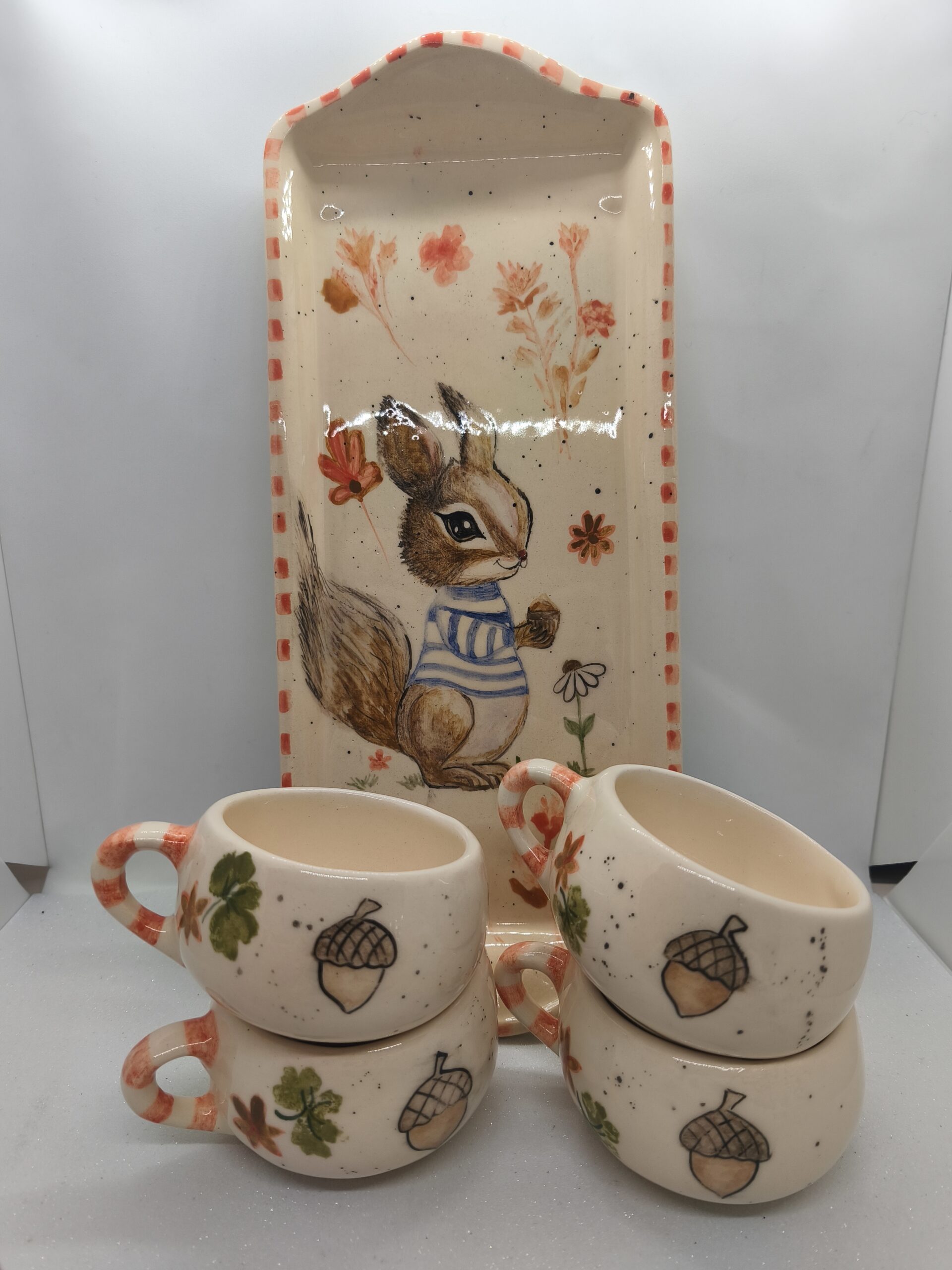 Juego de Cafe compuesto por una bandeja rectangular y cuatro posillos.
